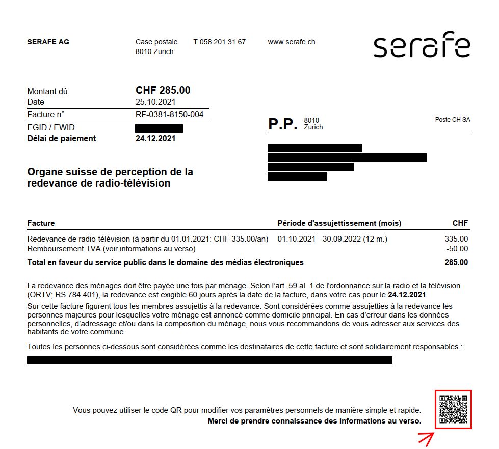 Les ménages et les entreprises utilisant la radio ou la télévision reçoivent chaque année une facture de la SERAFE AG. SERAFE signifie Centre suisse de perception de la redevance radio et télévision. La facture indique les personnes qui sont solidairement responsables du paiement de cette redevance.