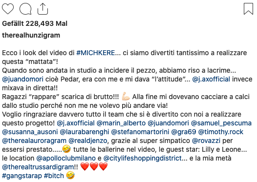 Dans cet exemple, une plaignante estimait que le post Instagram de Michelle Hunziker aurait dû être clairement signalé comme contenu publicitaire, car il contenait des remerciements accompagnés de liens vers plusieurs entreprises impliquées dans la production de son clip de rap.