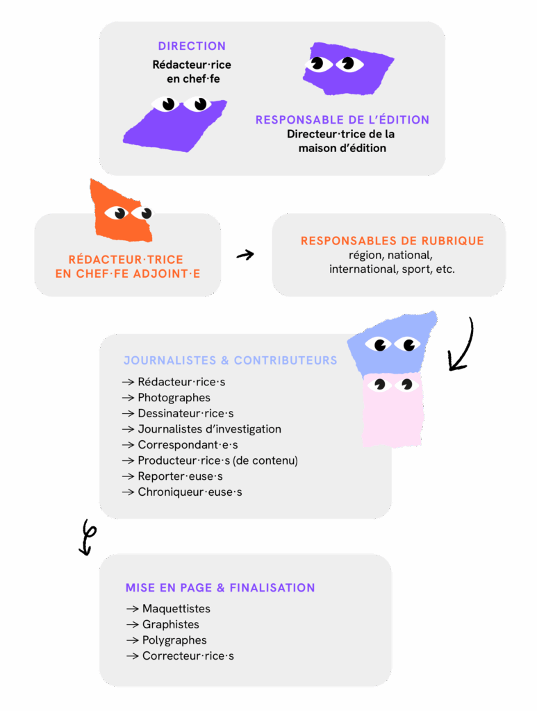Chacun est géré par un chef de rubrique. Le rédacteur en chef est chargé de veiller à ce que tout le monde adhère au style journalistique du média, par exemple si le média doit être plutôt divertissant (par exemple L’illustré-TV8) ou plutôt informatif (par exemple Le 1930 de la RTS).